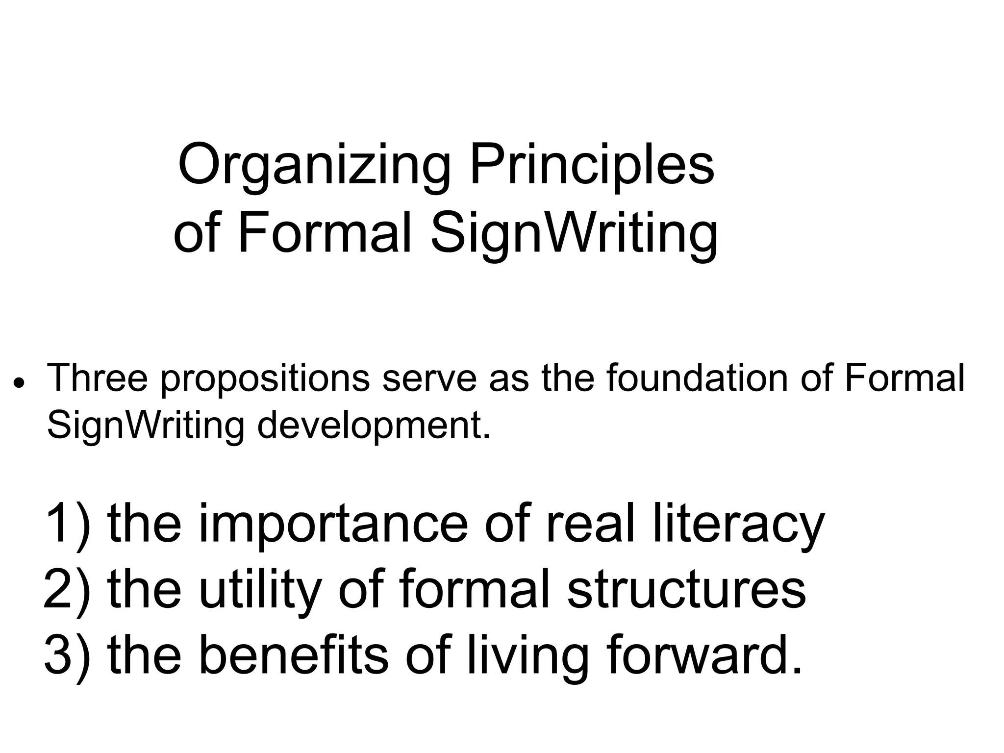 The document outlines three foundational propositions for formal signwriting: emphasizing real literacy, the utility of formal structures, and living forward. It discusses different levels of reading and writing, the significance of formal conventions in signwriting, and the potential for creative collaboration in communication. The author argues that understanding the past and working together enhances progress for future generations in the context of literacy and sign language.