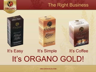 This document describes the Organo Gold business opportunity, which involves selling gourmet coffee blended with ganoderma mushrooms. The summary is: