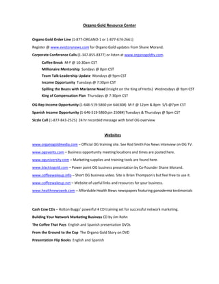 This document provides information about Organo Gold, including contact information for their order line, corporate conference calls, and income opportunity calls. It also lists several websites related to Organo Gold that contain training materials, presentations, videos, and other resources to support building an Organo Gold business.