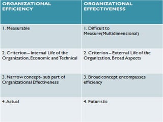 This document outlines objectives and topics around organizational effectiveness. The key points are:
