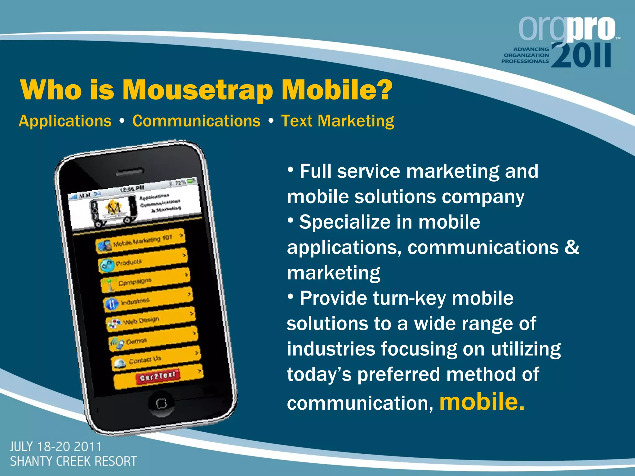 Mousetrap Mobile provides comprehensive mobile solutions, specializing in applications, communications, and marketing for various industries. The document discusses the evolution of mobile technology, smartphone and texting statistics, and highlights the increasing importance of mobile for effective communication and advertising. It also presents case studies demonstrating successful implementations of mobile applications in different sectors such as education, hospitality, and automotive.