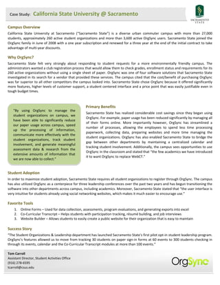 California State University at Sacramento (Sacramento State) has over 27,000 students and 260 student organizations. Sacramento State chose OrgSync in 2008 to manage student organizations in a more environmentally friendly way and reduce paper usage. OrgSync allows Sacramento State to streamline processes, speed up information processing, improve communication, track student involvement, and generate assessment data. Sacramento State requires all student organizations to use OrgSync and has begun expanding its use to other departments. The university has seen significant cost savings from reduced paper usage and more time spent managing student organizations rather than processing paperwork.