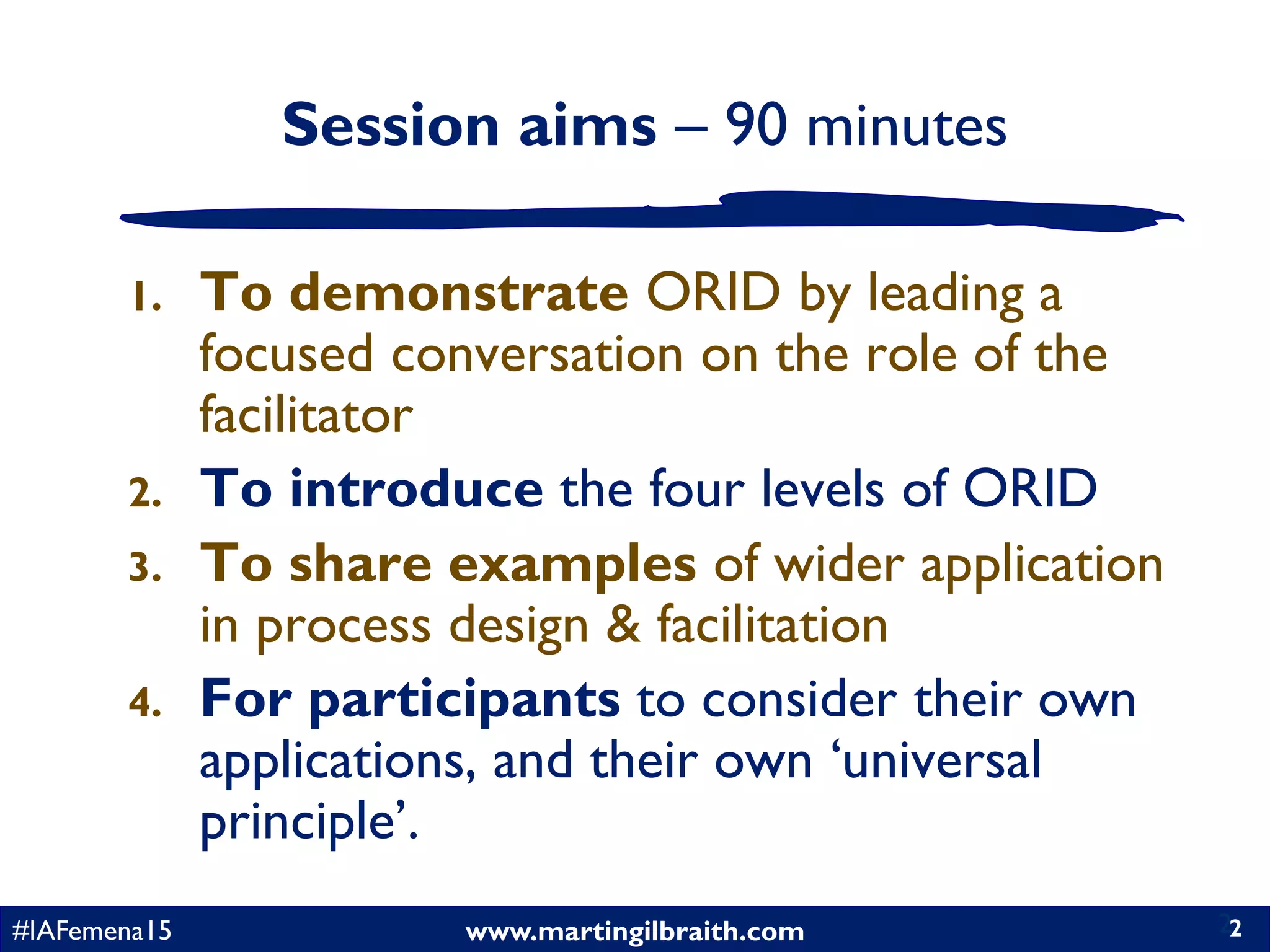 This document summarizes a 90-minute session on the ORID method of facilitation. The session aims to: 1) demonstrate ORID through a focused conversation on the role of facilitators, 2) introduce the four levels of ORID, and 3) share examples of wider ORID applications. It provides an overview of the ORID method and examples of how it has been applied in different facilitation contexts ranging from 15-minute conversations to 5-day planning sessions. Participants consider insights from the session, their own facilitation experiences and principles, and how they may apply something new. The document closes by suggesting further resources on facilitation methods.