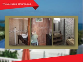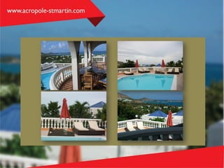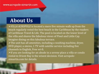 Villa Acropole is a short five-minute walk from one of the best beaches in the Caribbean, featuring a pool with stunning views and a well-equipped interior. The villa includes amenities like Wi-Fi, a full kitchen, and three bedrooms, each with an attached bathroom. Rental rates vary by season, accommodating anywhere from two to six guests, and further details can be found at acropole-stmartin.com.