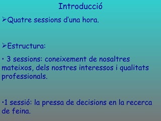 Introducció Quatre sessionsd’una hora. Estructura: 3 sessions: coneixement de nosaltres mateixos, dels nostres interessos i qualitats professionals. 1 sessió: la pressa de decisions en la recerca de feina.