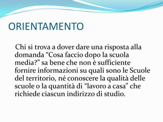 Il documento fornisce orientamenti su come gli studenti delle scuole medie possono decidere il loro percorso formativo post-scuola, enfatizzando l'importanza di una scelta personalizzata basata su interessi e capacità individuali. Viene proposto un processo in tre fasi: conoscenza di sé, raccolta di informazioni sulle scuole e progettazione di un piano formativo che combina i due aspetti. È evidenziato il significato di esperienze pratiche, come stage e open day, per aiutare gli studenti nel processo decisionale.