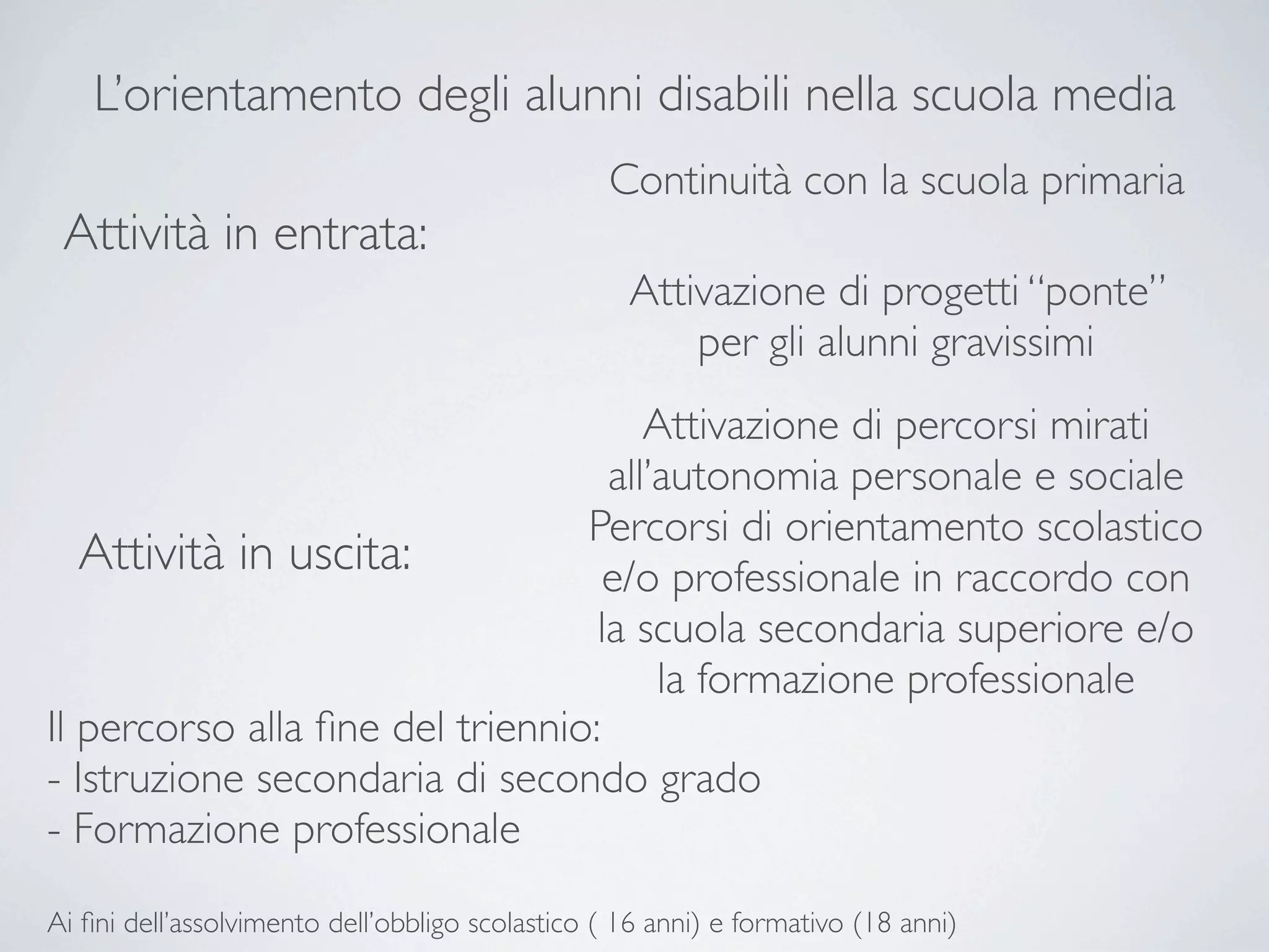 Il documento discute l'orientamento degli alunni disabili nelle scuole medie e superiori, evidenziando l'importanza della continuità con la scuola primaria. Vengono presentati progetti e percorsi per favorire l'autonomia personale e sociale, nonché opportunità professionali e formative post-obbligo scolastico. Inoltre, si delineano i percorsi di inclusione e integrazione per gli alunni disabili in formazione professionale e nel mondo del lavoro.