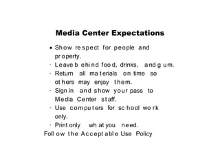 The Media Center is open before and after school for students to check out books, use computers, and do homework. Students must sign in with their name, grade, teacher, and period, and show their pass to staff. Books can be checked out from the circulation desk by saying the first three letters of your last name and must be returned on time. There are over 17,000 books in the Media Center organized by the Dewey Decimal system and listed in the card catalog.