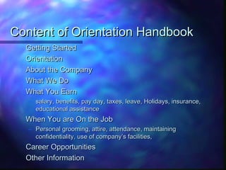 The document discusses an organization's orientation program for new employees and placement of employees in jobs. The orientation program briefs employees on the organization, benefits, rules, and policies by providing an employee handbook. It covers HR practices, safety, work schedules, breaks, company history, and products/services. Placement ensures job demands match individual skills, knowledge, abilities, interests, and personality. Factors like business type, HR philosophy, market resources, knowledge transfer possibilities, union pressure, and job nature impact placement decisions.
