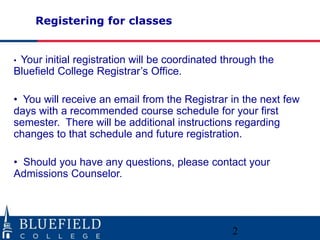 This document provides information for students registering for online courses through Bluefield College. It discusses registration procedures, participation policies, withdrawal deadlines, tuition and fees, financial aid processes, and student obligations. Key details include a September 2nd deadline to participate in order to avoid being dropped from courses, weekly participation monitoring by faculty, and financial aid eligibility requiring enrollment in at least one course per 8-week term.