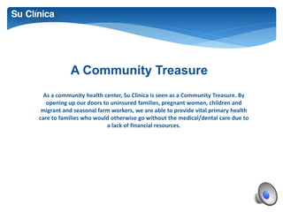 This document provides an overview of Su Clinica, a community health center. It details the services provided, including clinical services across pediatrics, dental, women's health and more. It discusses the center's role as a Federally Qualified Health Center and its focus on serving the uninsured and those in poverty in Cameron and Willacy Counties. The document also outlines policies, procedures, emergency preparedness plans and compliance programs expected to be followed by employees, students and volunteers at Su Clinica.