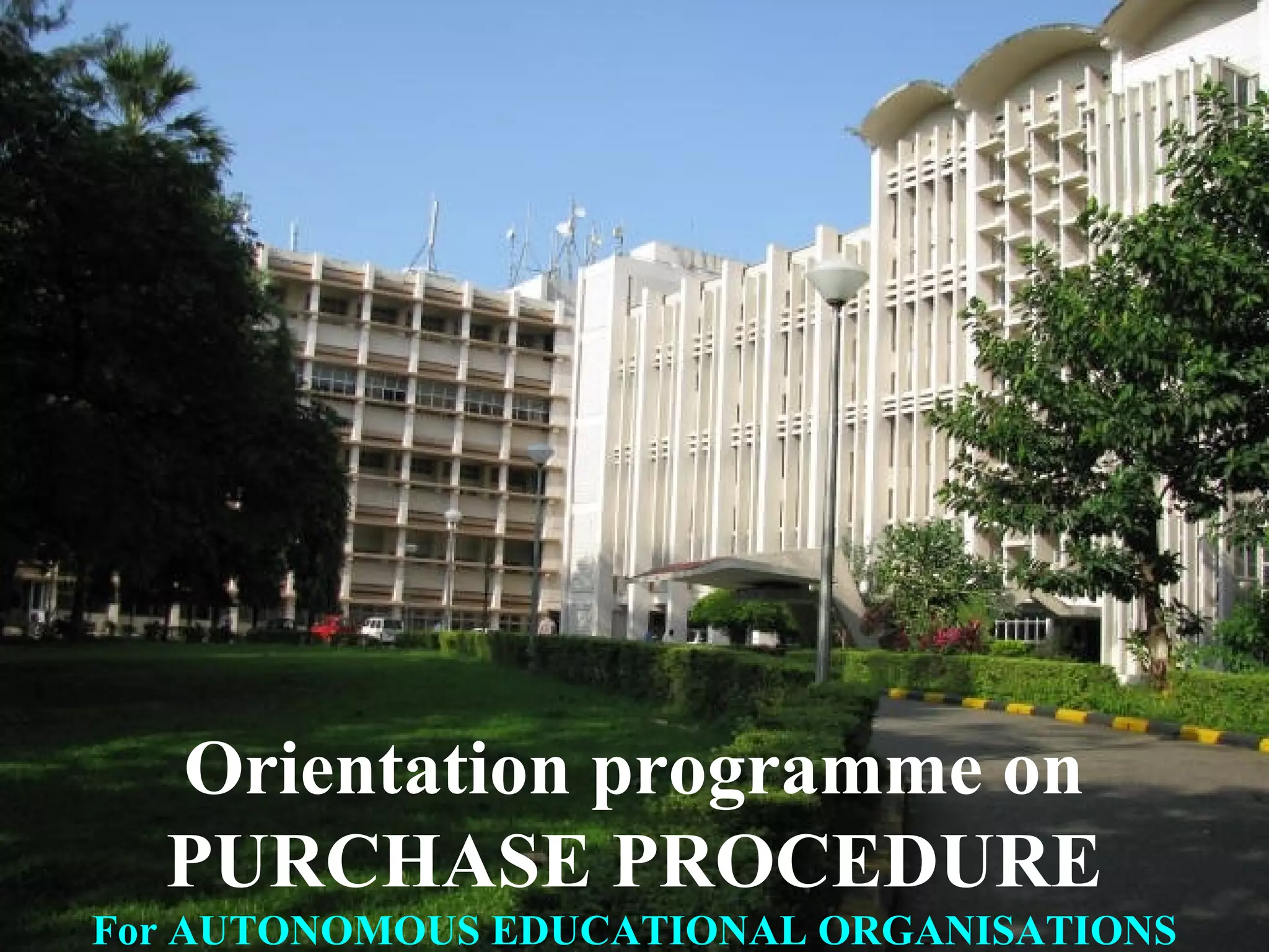 This document provides an overview of purchase procedures for autonomous educational organizations. It discusses key concepts like what constitutes a purchase, public procurement guidelines, tendering processes, evaluation methods, payment terms, and different types of purchases. The document outlines rules and considerations around obtaining competitive quotes and bids, assessing technical and financial viability of suppliers, establishing reasonable pricing, and ensuring transparency in procurement. Overall, it aims to educate on following applicable laws and best practices for efficient, economical and fair public purchasing.