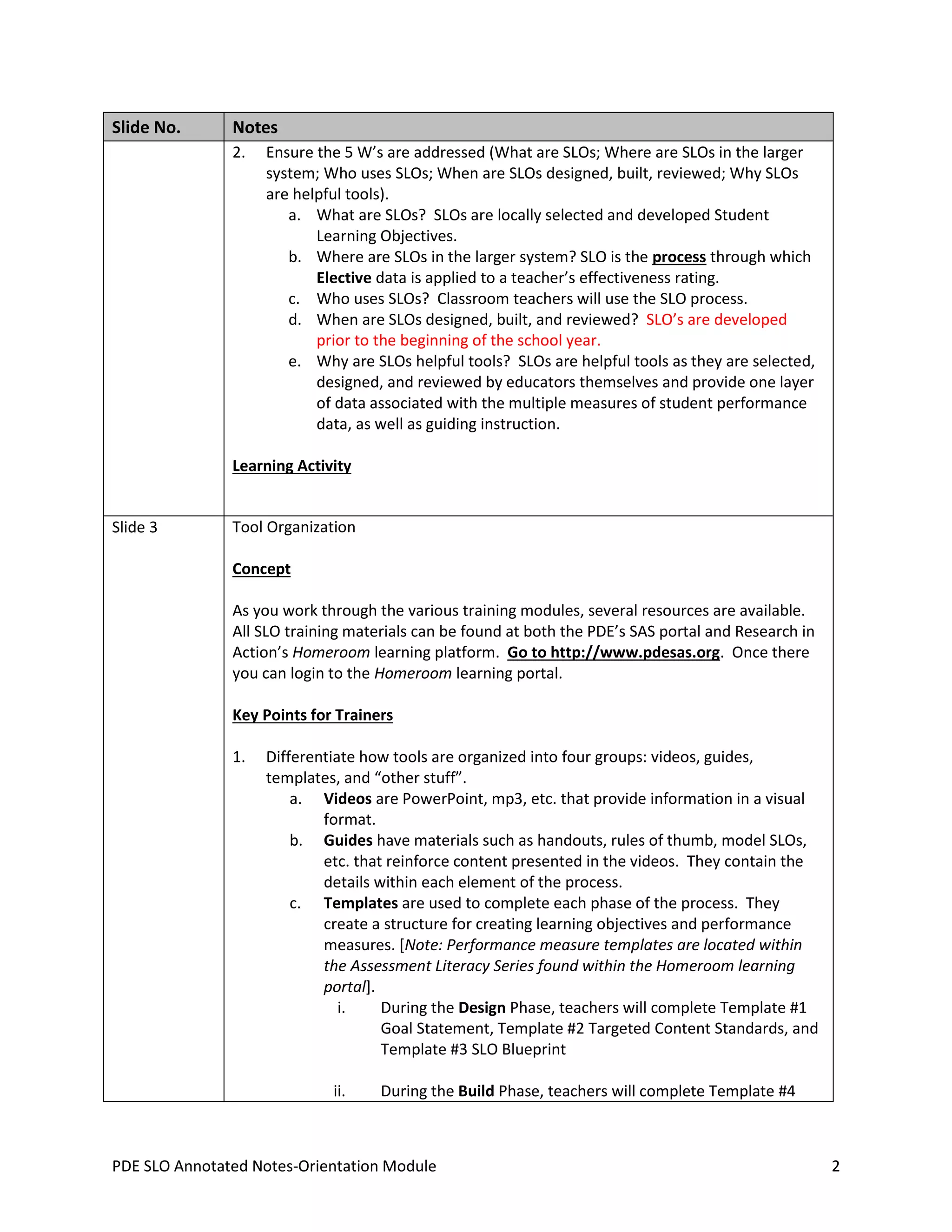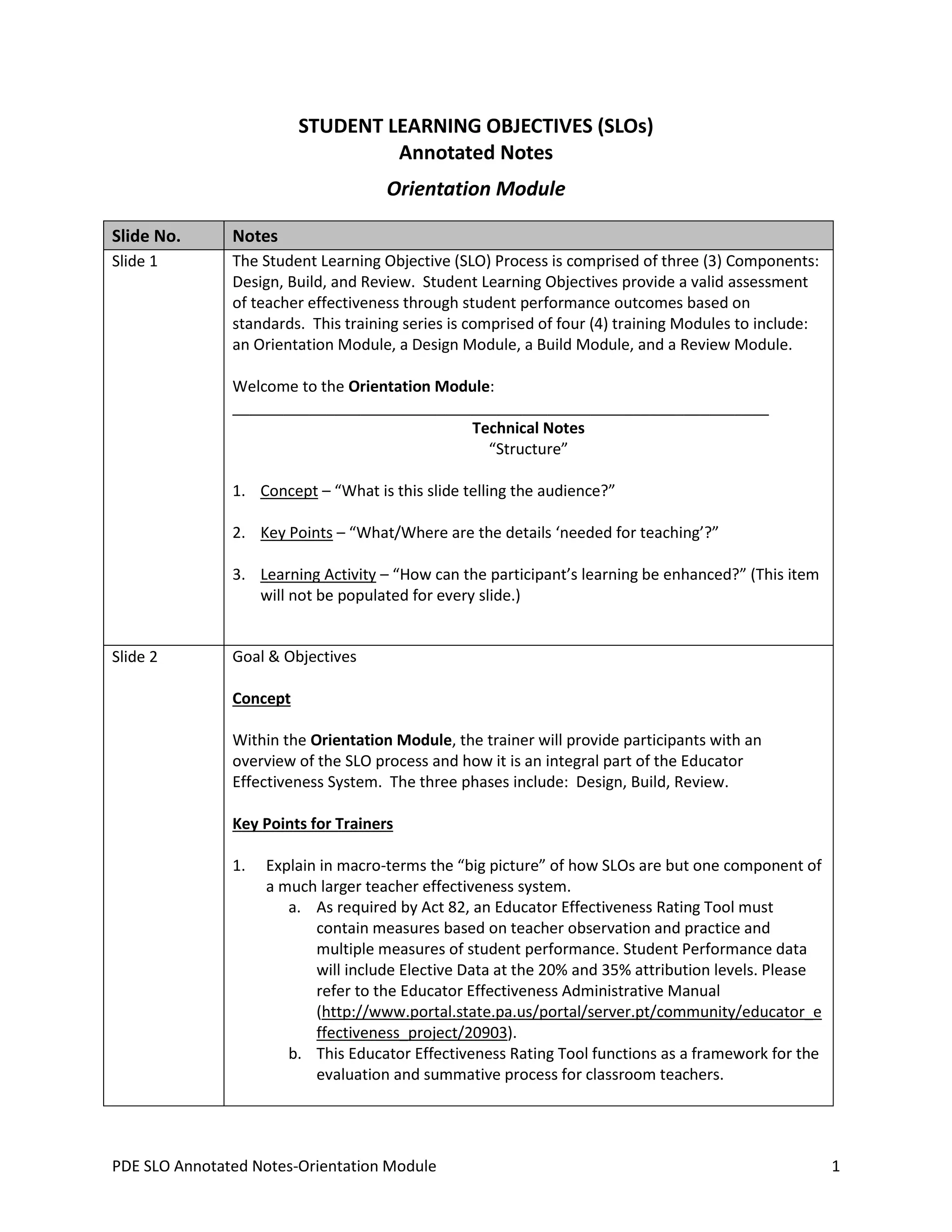 This document provides an overview and orientation for the Student Learning Objective (SLO) process, which comprises three components: Design, Build, and Review. The orientation module introduces participants to the goals and structure of the SLO process. It explains that SLOs are locally developed student performance objectives designed to provide valid assessments of teacher effectiveness. The module outlines the various phases and components of the SLO process and provides resources for participants, including guidelines, templates, and training materials located online.