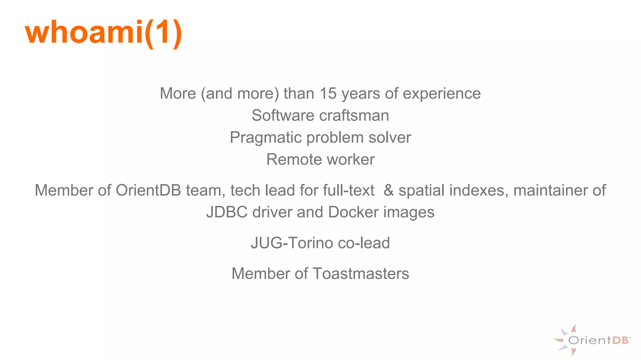 This document provides an overview of OrientDB, a multi-model database that combines features of document, graph, and other databases. It discusses data modeling and schema, querying and traversing graph data, full-text and spatial search, deployment scenarios, and APIs. Examples show creating classes and properties, inserting and querying graph data, and live reactive queries in OrientDB.