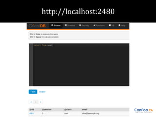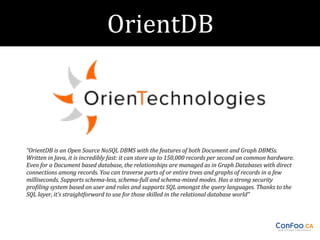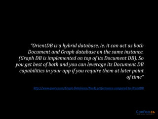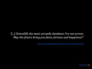 The document contains various queries and references related to a database system, particularly oriented towards user management and data retrieval. It includes examples of SQL-like commands for selecting user information and traversing relationships in a dataset. Additionally, it mentions programming language bindings and integrations with OrientDB.