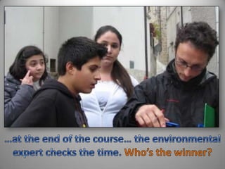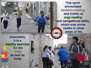 Orienteering is an outdoor activity where participants navigate between points using a detailed map. It originated as a military exercise in Scandinavia in the early 1900s and has become a competitive sport. It promotes environmental awareness, develops critical thinking skills, and increases physical fitness. In orienteering, students use compasses, rulers, and maps to navigate to specific locations marked by control flags or paper lanterns in the quickest time while making strategic route choices. The goal is to complete the course by visiting points in the correct sequence.