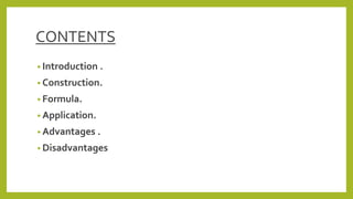 The document summarizes an orifice meter, which uses Bernoulli's theorem to measure fluid or gas flow rates. It has an inlet section, orifice plate, and outlet section. Orifice meters are commonly used in water treatment, natural gas, petrochemicals, oil filtration, and refineries. They are inexpensive, can be installed vertically, horizontally or inclined, and have low maintenance costs. However, they require straight piping and fluid properties can impact accuracy.