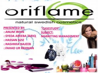 - The document discusses Oriflame's marketing strategy including segmentation, targeting, differentiation, positioning, and marketing mix. It also covers Oriflame's operations, sales, profits, competition, and challenges in markets like Pakistan.