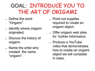 The document introduces origami, the Japanese art of paper folding. It defines origami, explains that it originated in China but was introduced to Japan, where it developed its own history and was later named "origami" by the famous origami artist Akira Yoshizawa. The summary provides essential information about origami in 3 sentences: Origami is the Japanese art of paper folding that originated in China but was introduced and developed in Japan, where famous artist Akira Yoshizawa later named and standardized it. The document recommends origami supplies and websites for learning origami and includes a video demonstrating how to make an origami cat.