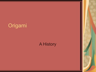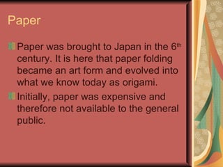 Paper folding originated in Japan in the 6th century and evolved into the art of origami. Initially, paper was expensive and reserved for formal ceremonies, where simple folded designs symbolized sincerity. Paper making spread from Asia to Europe between the 8th and 12th centuries along the Silk Road. In the 1950s, standardized folding symbols were developed to describe origami folds, making the craft more accessible. Origami grew in popularity and complexity, with professional artists designing intricate models.