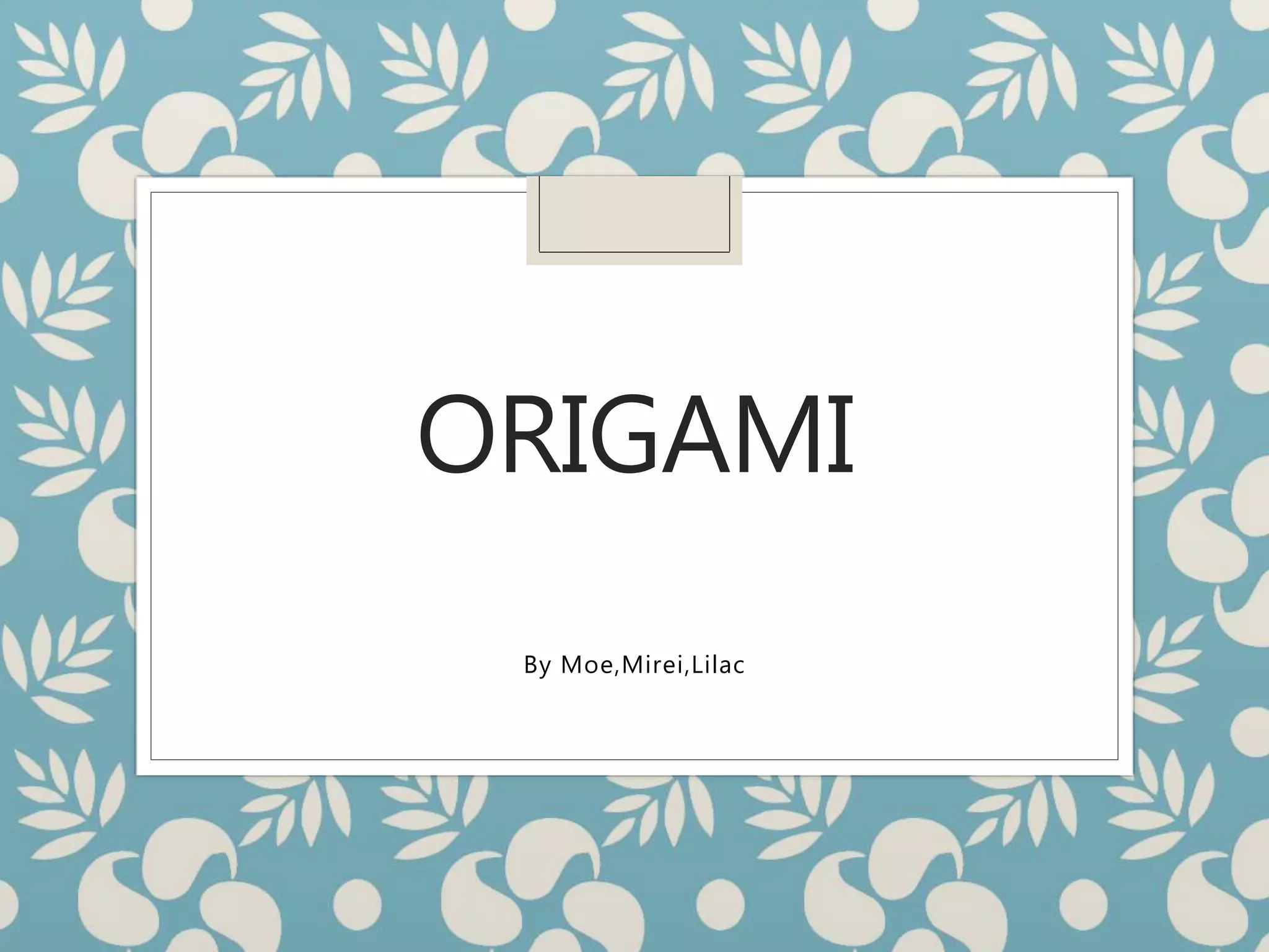 Origami is the art of folding paper into objects like animals, furniture, and food. It started in Japan during the Muromachi period when gifts were wrapped in decorative paper. By the 1900s, origami became a popular activity for children. The word origami comes from the Japanese words "ori" meaning to fold, and "kami" meaning paper. Common origami models include cranes, dart shapes, and paper planes, but more complex designs are now being created as origami gains worldwide recognition. In Japan, thousand origami cranes strung together symbolize longevity and peace, inspired by the story of a girl named Sadako who made cranes while sick from radiation exposure after the atomic bombing of Hiro