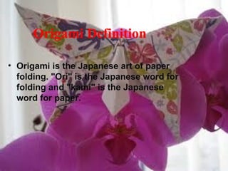 Origami is the Japanese art of paper folding. It began in China but spread to Japan, where it developed further. There are many types of origami beyond just birds and boats, and different ways to categorize folds. The history of origami involved symbolic figures folded from scarce paper for ceremonies. Akira Yoshizawa helped popularize origami in the 1950s. Origami has connections to geometry through the shapes and angles created by folding.