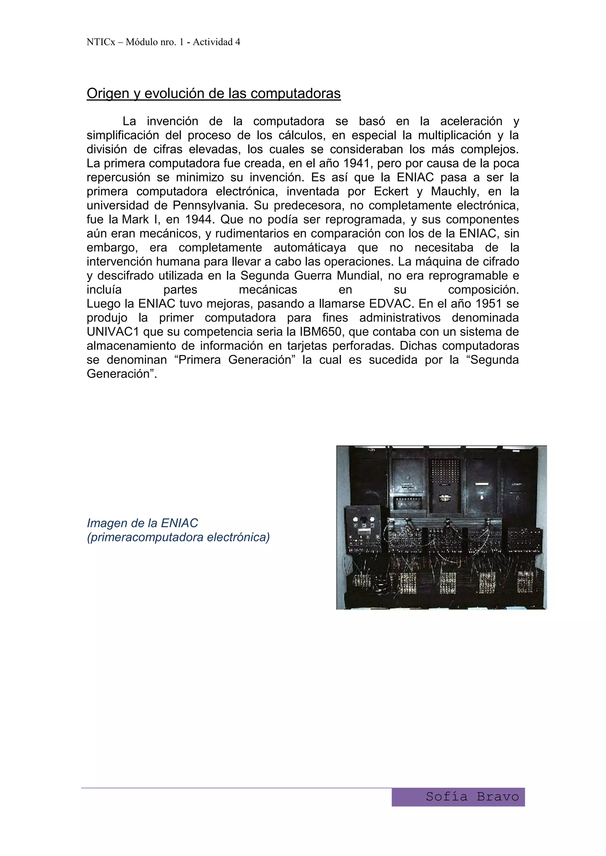 El documento describe la evolución de las computadoras desde su origen hasta la generación actual. Comenzó con la creación de la ENIAC, la primera computadora electrónica en 1946. Luego vinieron mejoras como el uso de transistores en lugar de tubos de vacío, el desarrollo de circuitos integrados y los microprocesadores, y el pasó de computadoras grandes a computadoras personales más pequeñas y potentes. Cinco generaciones de computadoras se describen junto con avances clave en diferentes períodos.