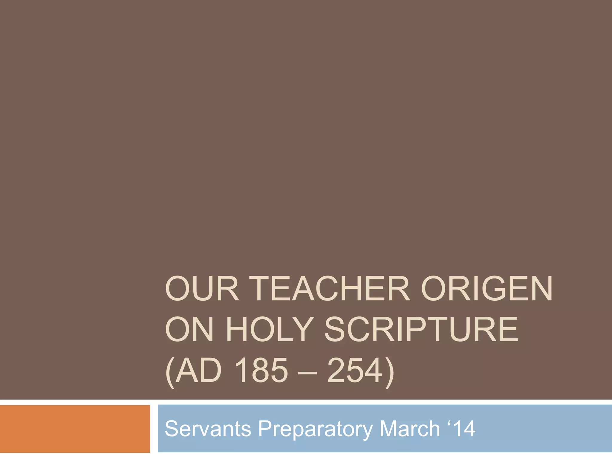 Origen was one of the first great Christian scholars and theologians. He established a catechetical school in Alexandria where he taught and wrote extensively on scripture. Origen believed scripture contained deeper allegorical meanings beyond the literal text and should be interpreted through reason and philosophy informed by faith. He was influential but considered heretical for some of his beliefs including the preexistence of souls and universal salvation. Origen viewed scripture as divinely inspired and the key to understanding God and spiritual truth.