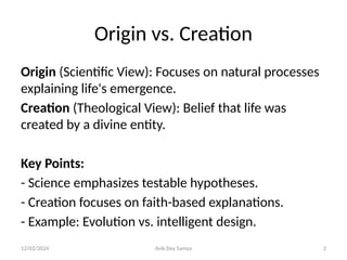 The document explores the contrasting views on the origins of life, emphasizing the scientific perspective of evolution versus the theological view of creation. It outlines key scientific theories like chemical evolution and abiogenesis, while highlighting the lack of empirical evidence supporting the theory of special creation. Overall, it asserts that evolution, supported by natural processes and genetic evidence, offers a more robust explanation for the diversity of life.