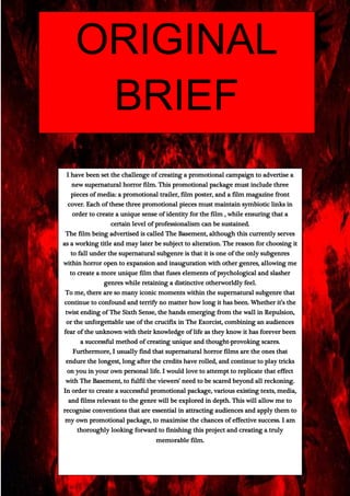 The document discusses creating a promotional campaign for a new supernatural horror film called "The Basement". It explains that the campaign will include a trailer, poster, and magazine cover that are linked thematically. The film aims to fuse psychological and slasher elements while retaining a supernatural feel. Researching iconic moments from films like "The Sixth Sense" and "The Exorcist" that continue to terrify audiences will help design promotional material that scares viewers deeply and leaves a lasting impression. The goal is to create a successful campaign that attracts audiences through applying genre conventions.
