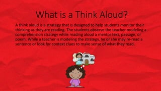 The document discusses using think alouds in elementary classrooms to improve reading comprehension. It defines think alouds as a strategy where teachers model their thinking process while reading aloud. Research shows that think alouds help students understand they can comprehend texts more when teachers demonstrate different strategies. The document provides guidance on how to implement think alouds, including identifying a strategy, modeling it, and having students practice the strategy in small groups with support. It emphasizes teaching students to monitor their own comprehension is the ultimate goal of think alouds.