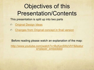 This document provides original design ideas and changes from the original concept for a King of the Hill map called Koth_Abandoned_Intellege. The map was intended for 16 players total split evenly between two teams. It included symmetrical spawn rooms connected to sniper towers and a multi-level control tower capture point in the center. The final version separated the two sides more and added cover in open areas to change player strategies.