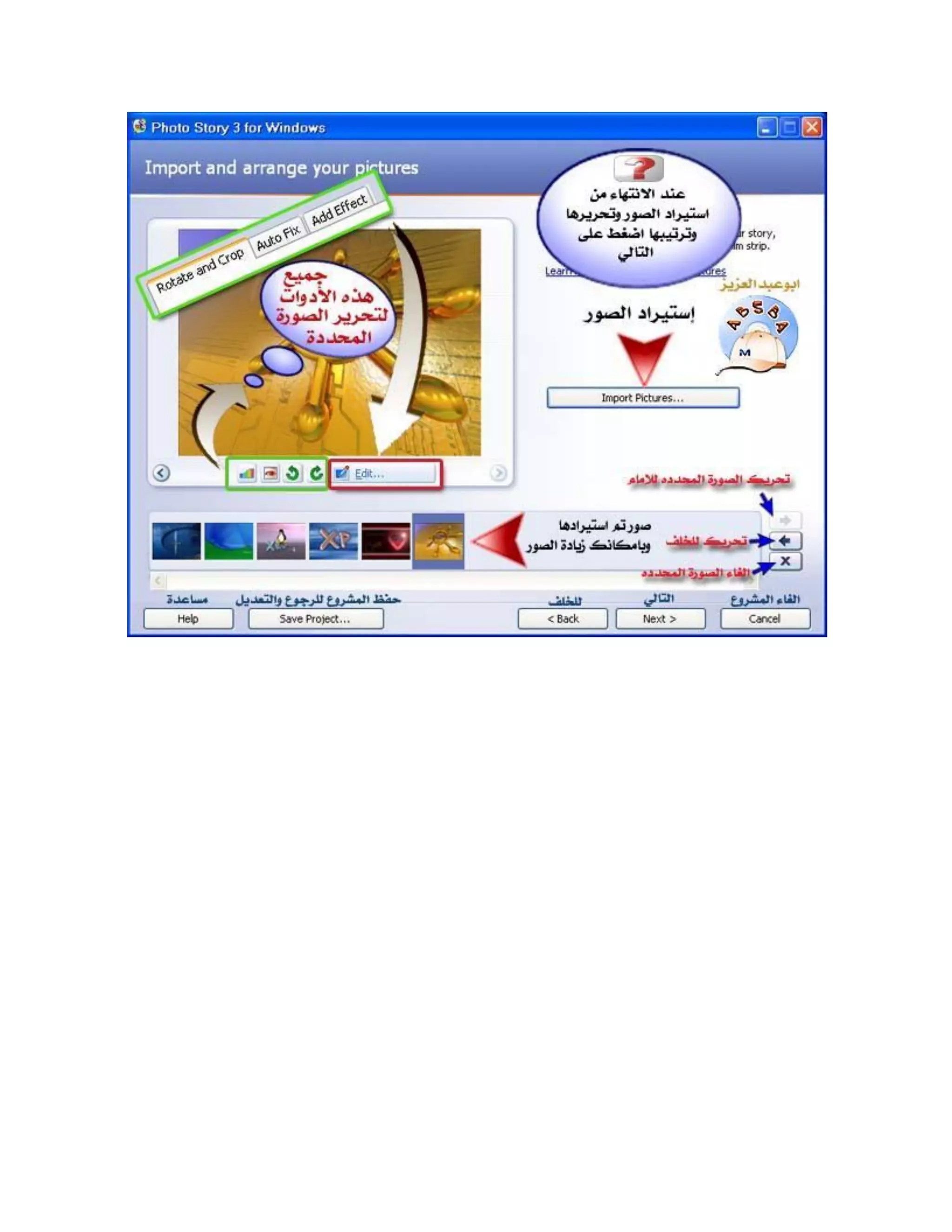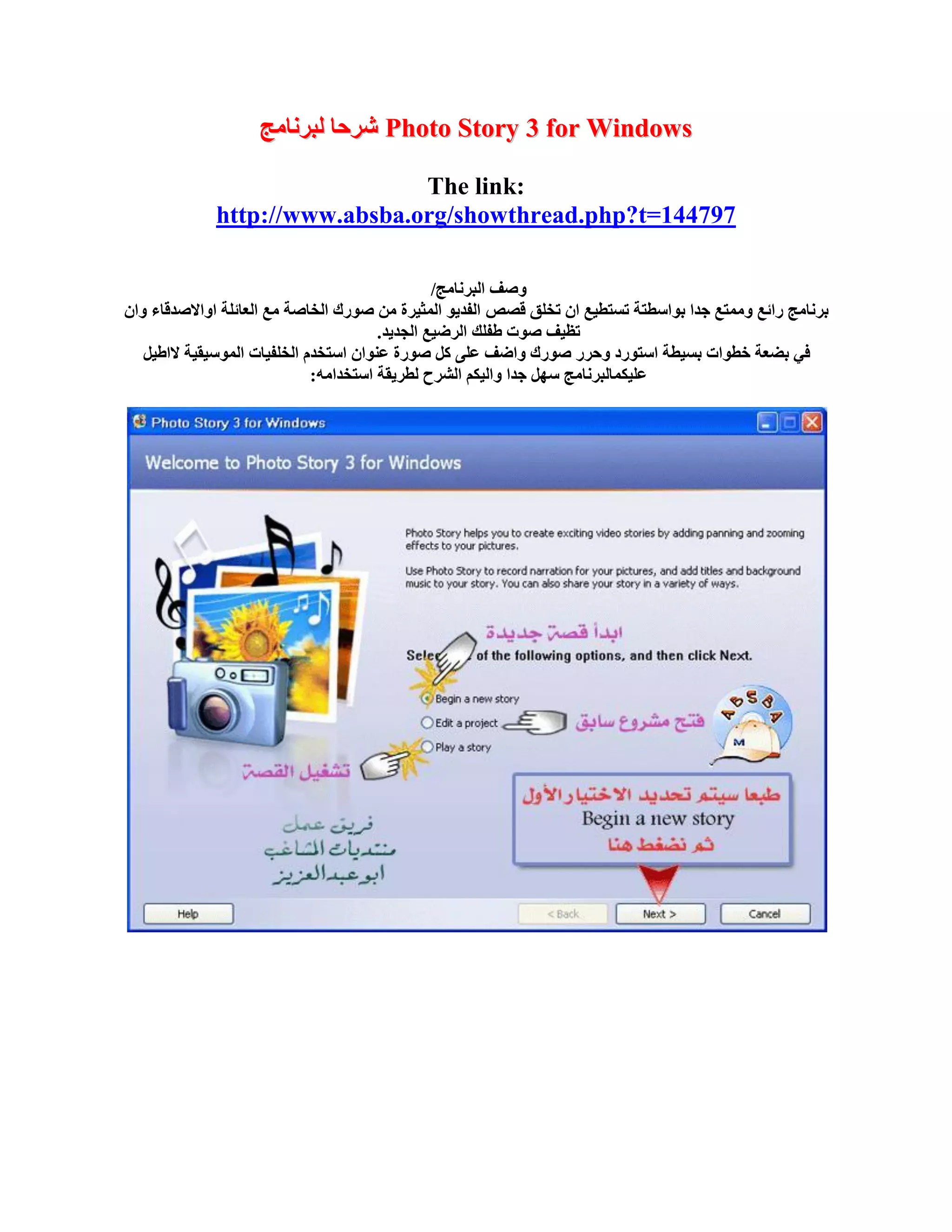 يشرح الوثيقة كيفية استخدام برنامج 'photo story 3 for windows' لإنشاء قصص فريدة باستخدام الصور الخاصة بالعائلة والأصدقاء. يتضمن البرنامج خطوات بسيطة لاستيراد وتحرير الصور وإضافة خلفيات موسيقية. كما أنه سهل الاستخدام ويقدم تعليمات واضحة لمساعدته في تحقيق ذلك.