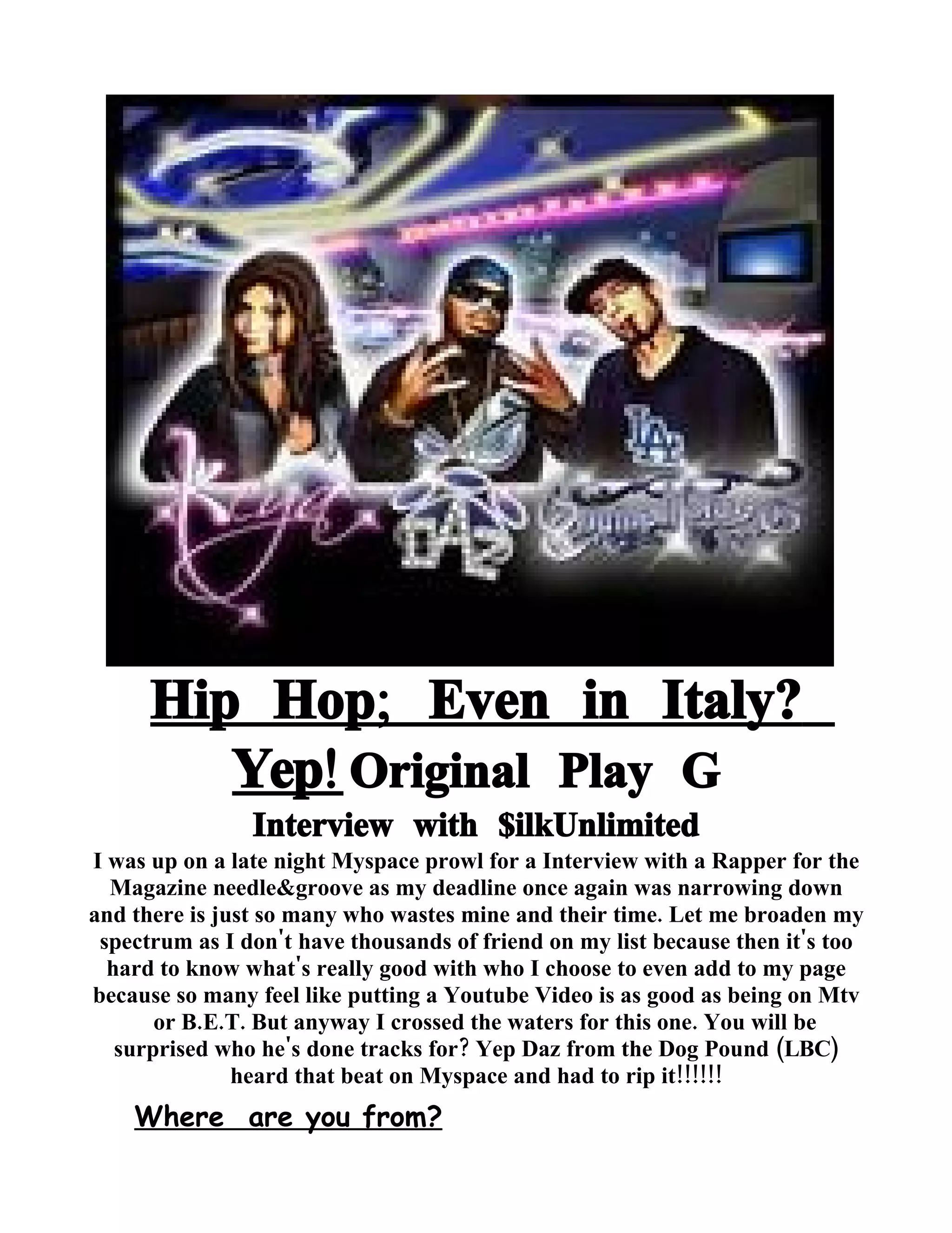 The document features an interview with the rapper $ilkunlimited, who discusses his roots in Palermo, Italy, and his 14-year career in hip-hop. He expresses his desire for a serious record label to help promote his bilingual music, blending Italian and English, and highlights his admiration for Tupac as a main influence. The rapper emphasizes the importance of visibility and marketing in the music industry to reach a wider audience.