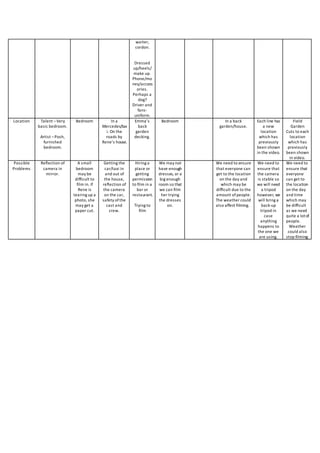 This document provides a detailed treatment for a music video featuring a female artist. It outlines the storyline, which follows a woman who dreams of becoming confident and famous. The treatment includes details of each scene, including duration, location, cast, costumes, and any potential problems. It describes scenes such as the woman dancing at home, being picked up in a car, trying on dresses, arriving at a fancy party, and having her daydream rewind to reality at the end. The overall narrative is intended to promote a message of female empowerment.