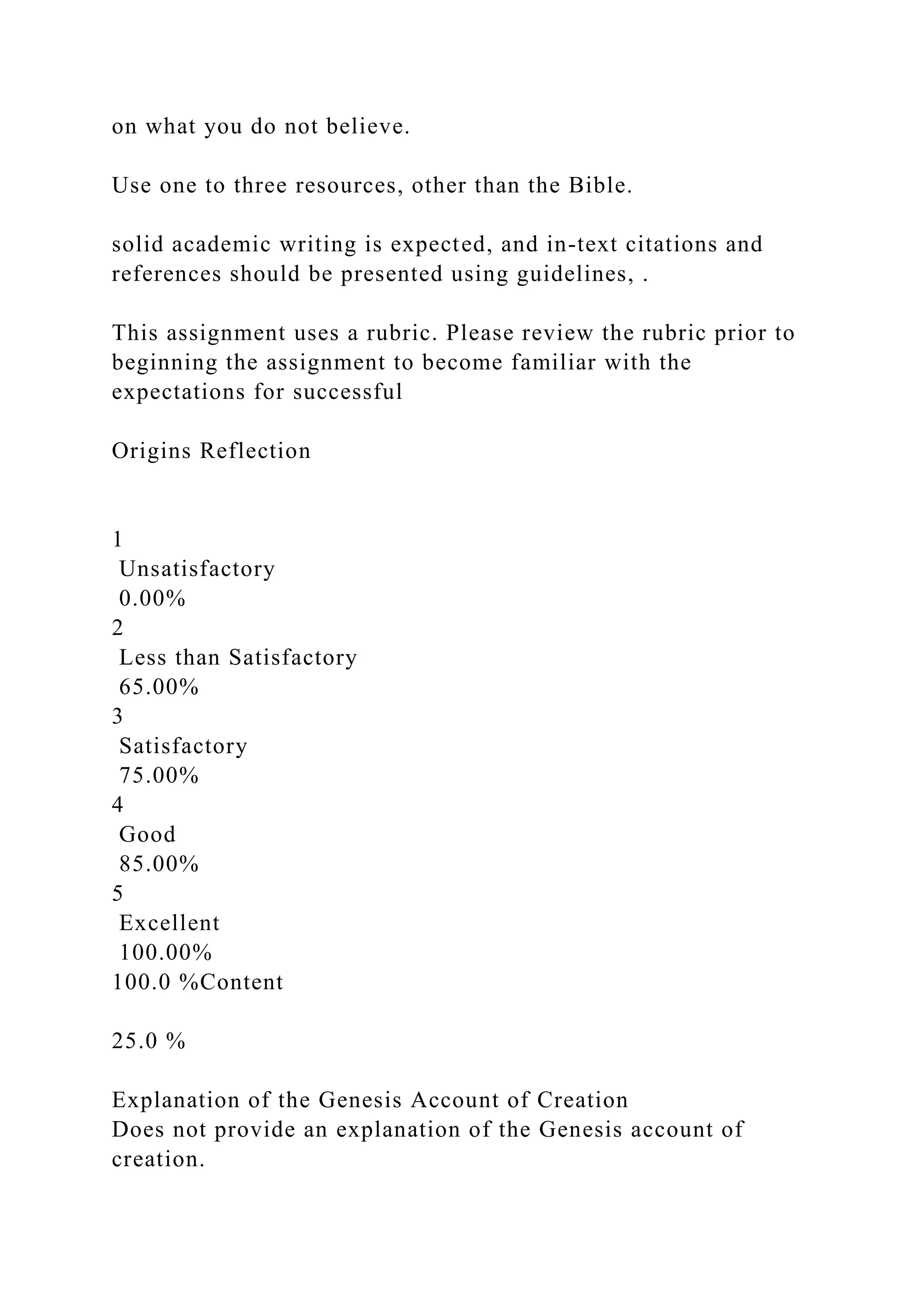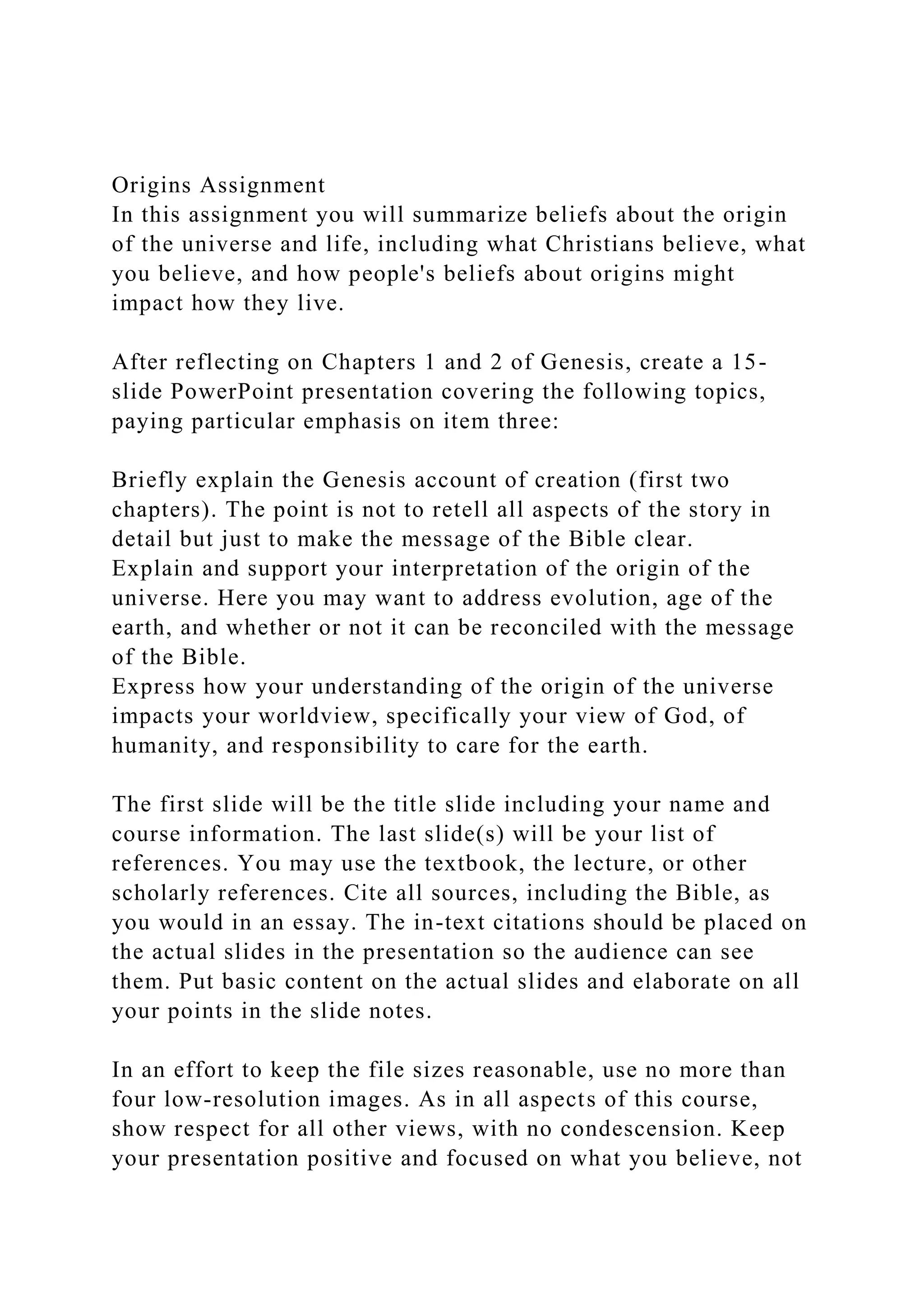 The assignment requires a 15-slide PowerPoint presentation summarizing beliefs about the origin of the universe and life, particularly emphasizing the Genesis account of creation. It involves explaining the author's interpretation of the origin of the universe, addressing evolution and the age of the earth, and reflecting on its impact on worldview, including views of God, humanity, and environmental responsibility. The presentation must adhere to academic guidelines, include citations, and maintain respect for differing beliefs.