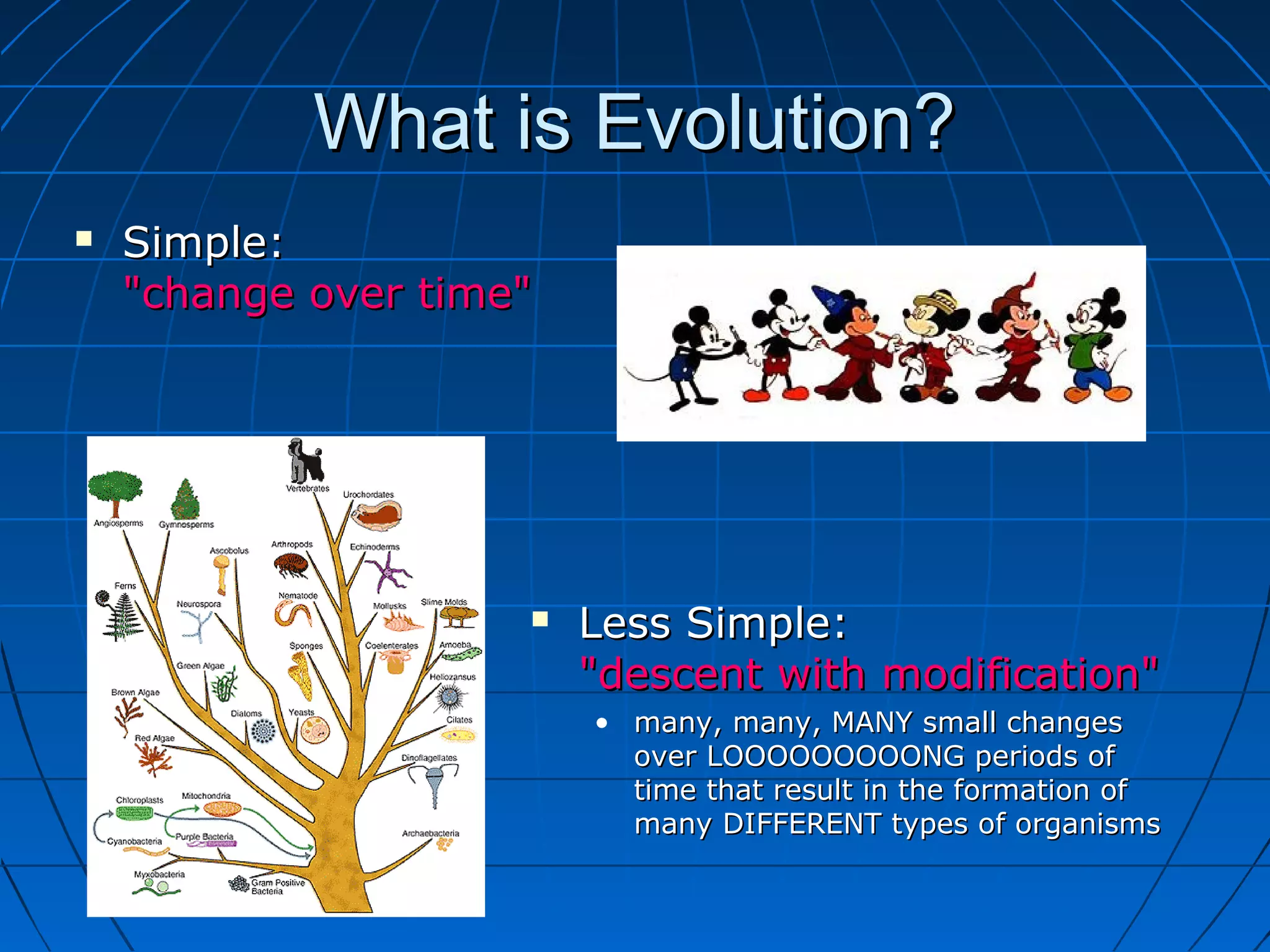 The document discusses key concepts related to evolution including natural selection, descent with modification, mutations, adaptations, genetic variation, genetic drift, microevolution, macroevolution, speciation, and coevolution. It explains how small gradual changes over extremely long periods of time through various evolutionary mechanisms like natural selection can result in major changes within populations and the formation of new species through the process of descent with modification.