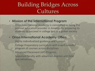 Orion International Academy aims to prepare international students for college and life in a global society through its rigorous academic program and cultural experiences. The school offers individualized support and a college preparatory curriculum with Advanced Placement courses taught by experienced faculty. Students can participate in winter and summer programs taking classes alongside American students and experiencing American culture through activities. They live either in dormitories for a collegiate experience or with host families to experience American family life firsthand. The school aims to give students an educational future for success through its American curriculum and diverse student body.