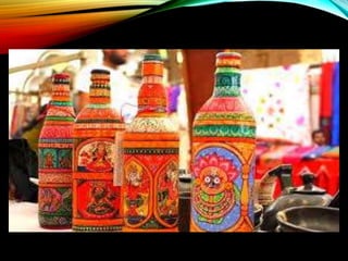 The document provides information about the Indian state of Orissa (Odisha). It discusses Orissa's population, capital, chief minister, area, and language. It also summarizes Orissa's history from ancient times to British rule. Key aspects of Orissa's culture and traditions are highlighted, including Odissi music and dance, festivals, cuisines like dal and rice dishes, famous temples like the Sun Temple and Jagannath Temple, and handicrafts like lacquer work and stone carving. The document encourages visiting Orissa after the pandemic to experience its culture, art, and spices.