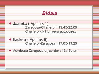 Bidaia Joateko (Apirilak 1) Zaragoza-Charleroi : 19:45-22:00 Charleroi-tik Horn-era autobusez Itzulera ( Apirilak 8) Charleroi-Zaragoza : 17:05-19:20 Autobusa Zaragozara joateko : 13:45etan