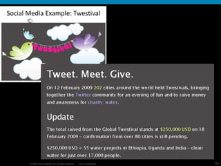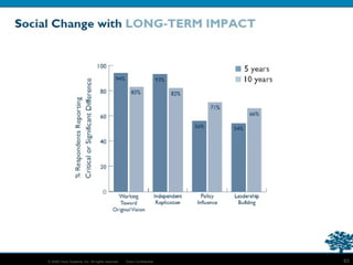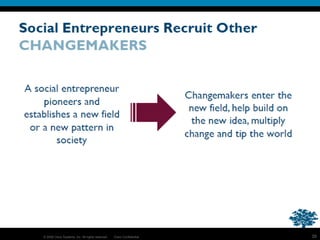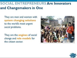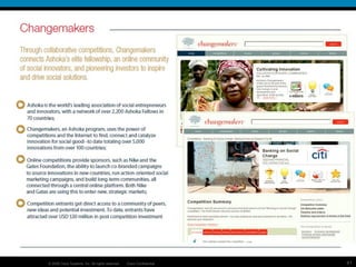 This document summarizes an online network tool kit for connecting social entrepreneurs and practitioners working in developing markets. The objectives are to focus on the citizen sector as the baseline, pilot an online network to drive solutions, and create a scalable social innovation toolkit. The toolkit would provide discussion forums, wikis, blogs and other tools to connect people, share knowledge, and leverage existing expertise to innovate and scale solutions across geographic locations. The goal is to accelerate social innovation by linking entrepreneurs and enabling new markets through collaboration.