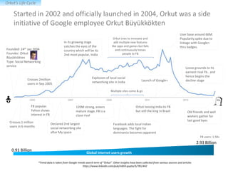 Orkut, a social networking service founded by Google employee Orkut Büyükkökten, was launched in 2004 and quickly gained popularity, surpassing 1 million users in just six months. However, it faced declining usage in favor of Facebook, especially in India, while maintaining a strong user base in Brazil until its eventual decline. Despite attempts to innovate with new features, Orkut could not compete with Facebook, leading to its reduced user base and eventual shutdown.