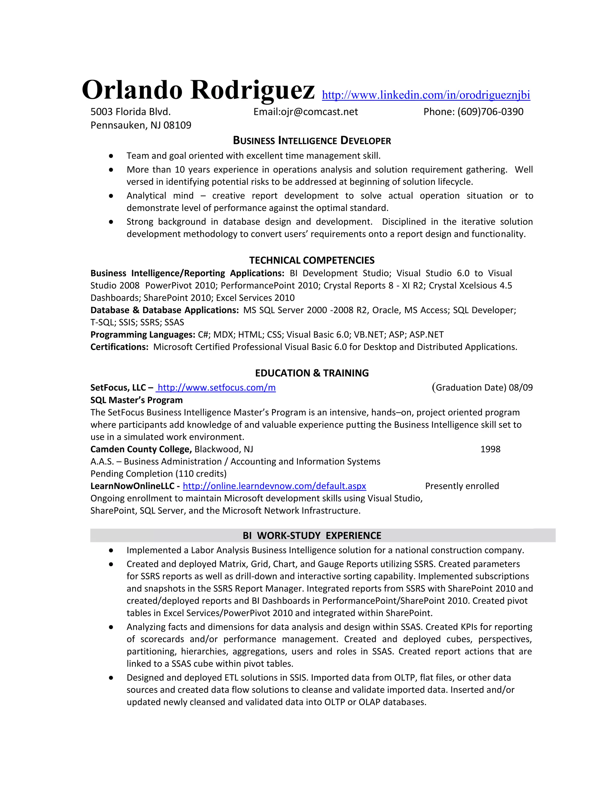 Orlando Rodriguez has over 10 years of experience in business intelligence development and operations analysis. He has strong skills in SQL Server, Visual Studio, SSIS, SSRS, and SSAS. He has implemented BI solutions for clients including building reports, dashboards, cubes and ETL processes. He holds a certification in Visual Basic and an associate's degree in business administration. Currently he is pursuing ongoing training to maintain his Microsoft development skills.