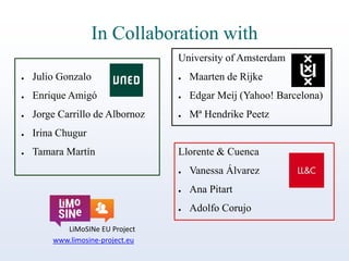 The document discusses online reputation monitoring (ORM) on Twitter, emphasizing its importance for entities like companies and personalities. It outlines the challenges faced in ORM, such as the lack of standard benchmarks and the necessity for both manual and automatic tools for monitoring, filtering, sentiment analysis, and topic detection. The document also presents goals to formalize ORM as scientific challenges, propose automatic solutions, and assess their efficacy through reusable test collections and evaluation campaigns.