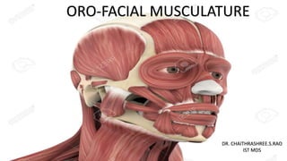 This document provides an overview of the oro-facial musculature. It begins with an introduction and classification of muscles, followed by the embryology of muscle development. It then describes the anatomy, innervation and actions of specific muscle groups including the scalp, ear, eyelid, extraocular, nose, mouth, neck and tongue muscles. It discusses the origins of cranio-facial muscles and compares muscle fiber types. Finally, it provides brief descriptions of some clinical considerations related to injuries of the scalp and face.