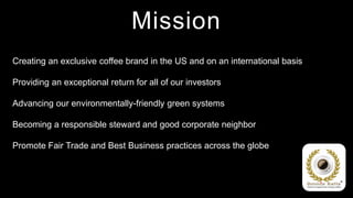 Emil Capital Partners is seeking $5 million in equity investment to launch an organic and specialty grade coffee brand called Oromia Kaffa focused on the growing US and global coffee markets, with projected revenues of $73.5 million and cumulative EBITDA profits of $20.1 million over the next 4 years under an experienced management team and strategic partnerships.
