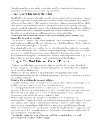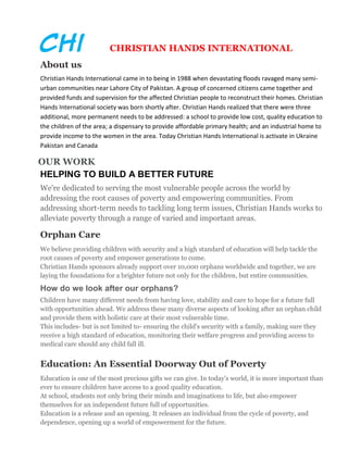 Christian Hands International was founded in 1988 to help Christian communities in Pakistan affected by devastating floods. It now operates in Pakistan, Ukraine, and Canada, working to alleviate poverty through orphan care, education, healthcare, hunger relief, emergency relief, and access to safe water. Key activities include sponsoring over 10,000 orphans worldwide, providing schools and medical care, distributing food, and building wells and sanitation systems. The organization is dedicated to empowering vulnerable communities and addressing the root causes of poverty through long-term development programs.