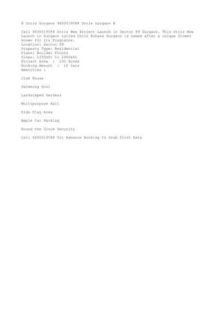 Orris Kohana Gurgaon is a new residential project launched by Orris in Sector 89, Gurgaon spread across 100 acres. The project offers builder floors between 1250-2400 sqft with an amenities like a clubhouse, swimming pool, landscaped gardens, and more. Interested buyers can call 9650019588 for advance booking and more details on booking amount and payment plans.