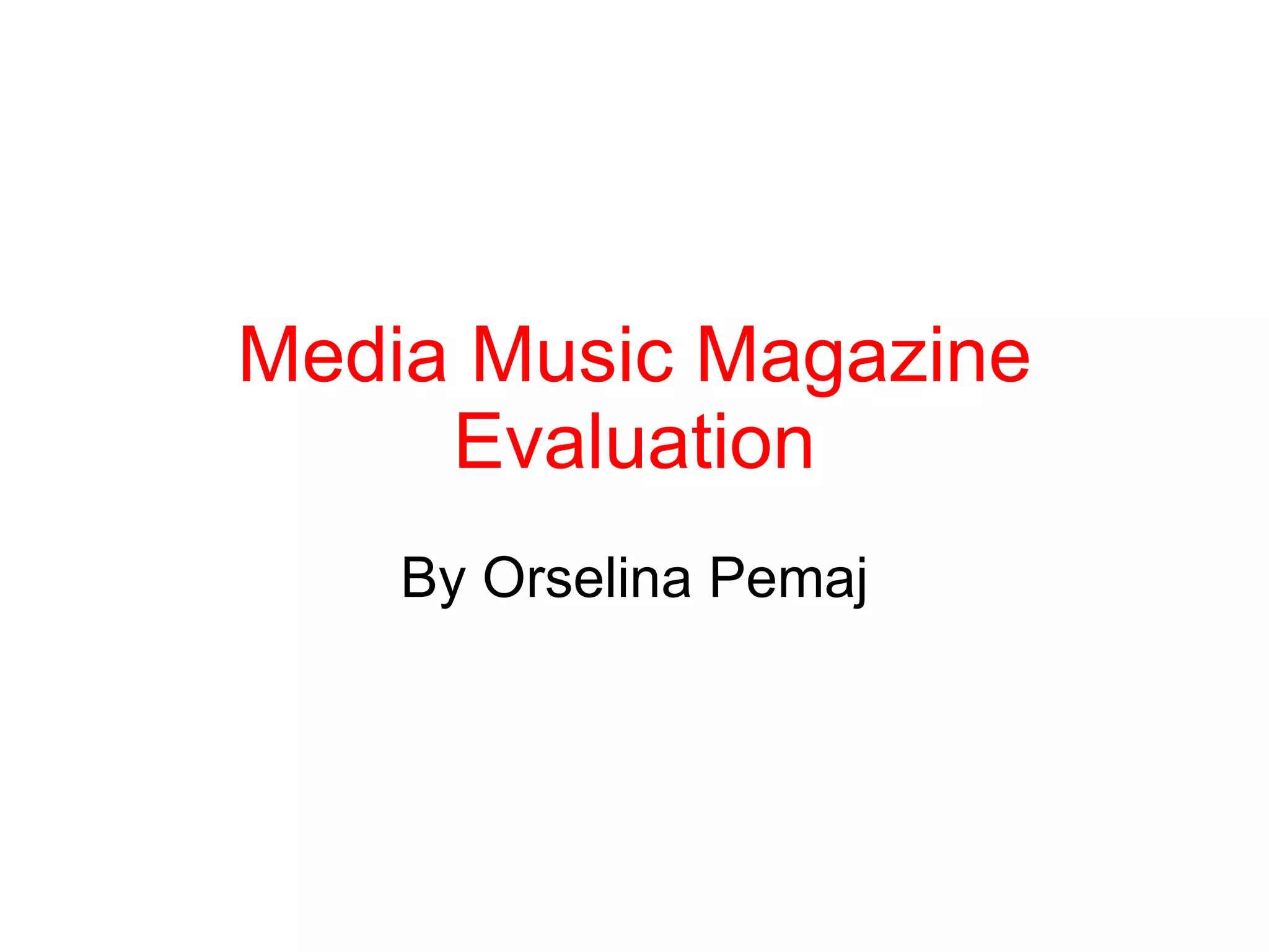 - The document is a media magazine evaluation created by Orselina Pemaj that analyzes how their magazine product uses and challenges conventions of real music magazines.