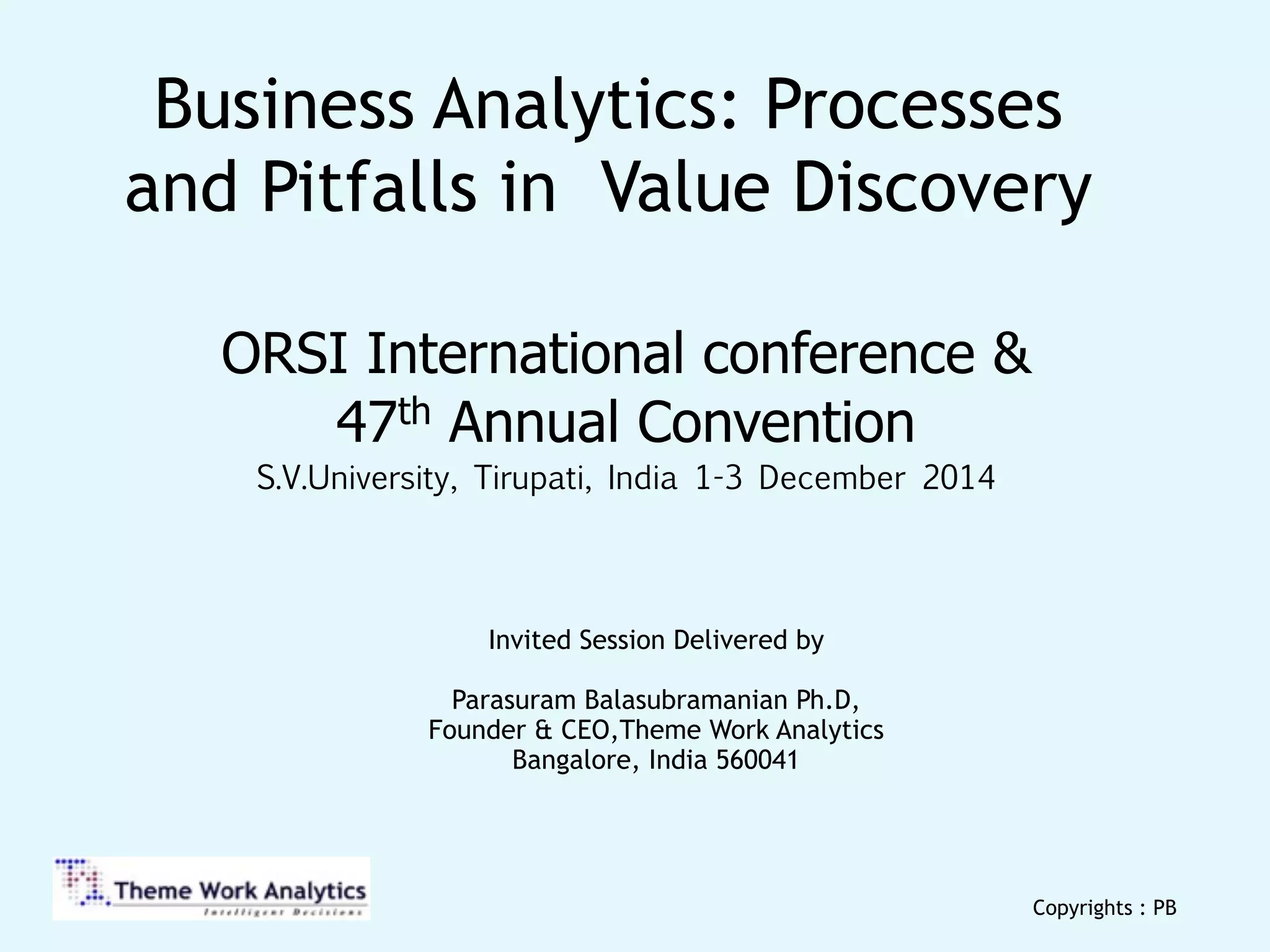 The document discusses the significance of analytics in business processes, emphasizing the importance of integrating knowledge from management science, computer science, and behavioral science to address issues like unsold inventory and lost sales opportunities. It highlights various applications of analytics in market segmentation, price discovery, and customer understanding, underscoring the need for continuous validation of models and data. Furthermore, the document warns about the limitations of big data analytics and the necessity of confirming data representativeness before making business decisions.